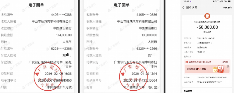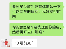 1月29日,陈先生向肖某支付了购车首付款10万元,同(tong)时(shi)向肖某确定交车日期,肖某微信回复“10号前交车”。“2月6日,肖某告知车辆已送达(da)广汽丰田4S店(深圳长合李朗店),要求我(wo)支付尾(wei)款。”陈先生说,于是当天他便付清了17.4万元尾(wei)款。