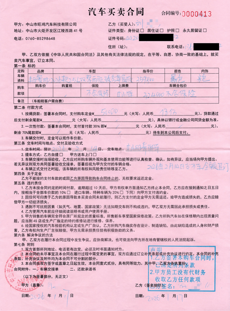 陈先生说,购车合同(tong)是与肖某的(de)公司——中山(shan)市旺鸿汽车科技有限公司签订的(de),合同(tong)约定交车时(shi)间为2026年2月14日,交车地点为中山(shan)旺哥聊车,同(tong)时(shi)合同(tong)注明,2月14日前不交车全额(e)退款。
