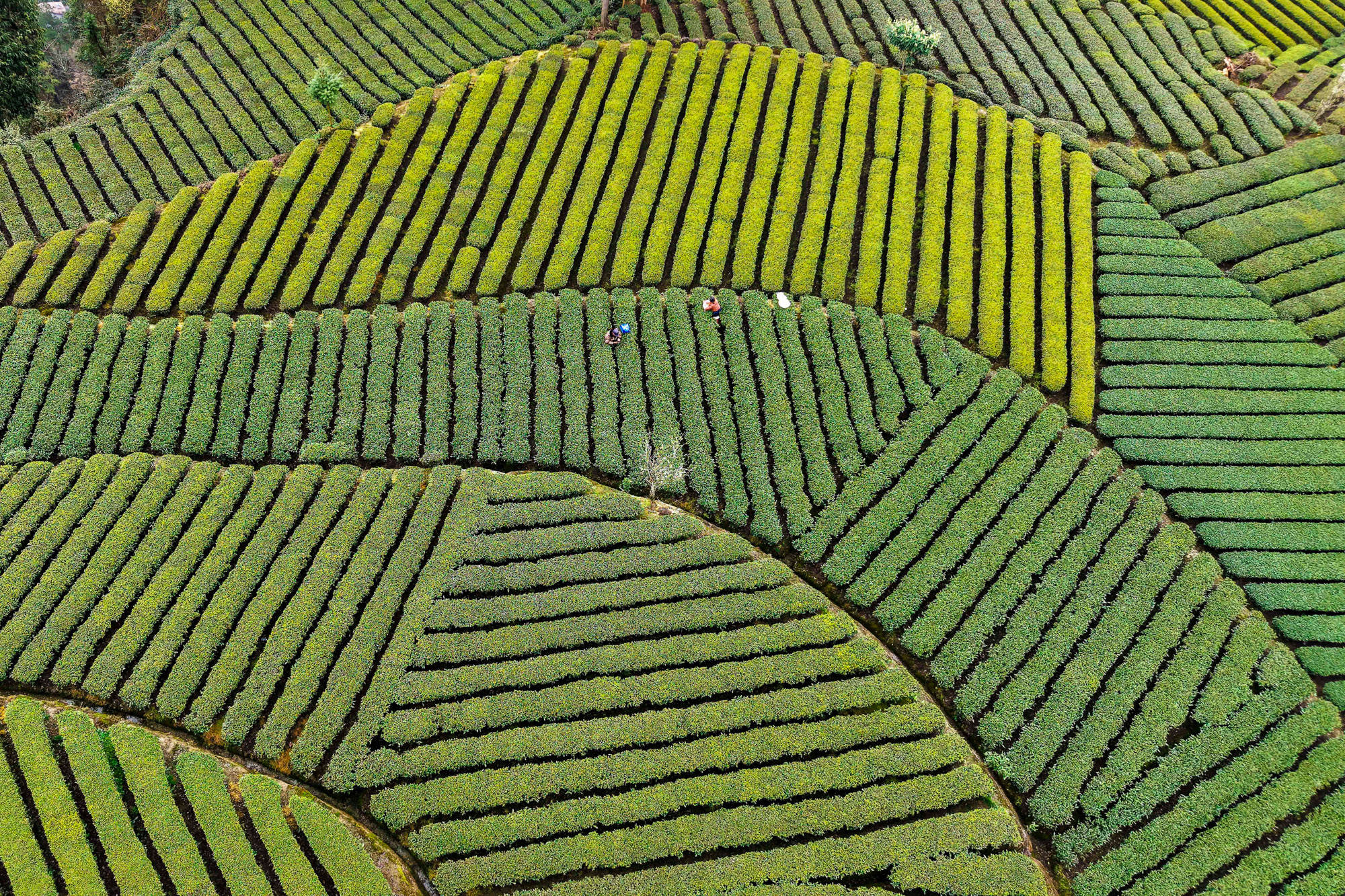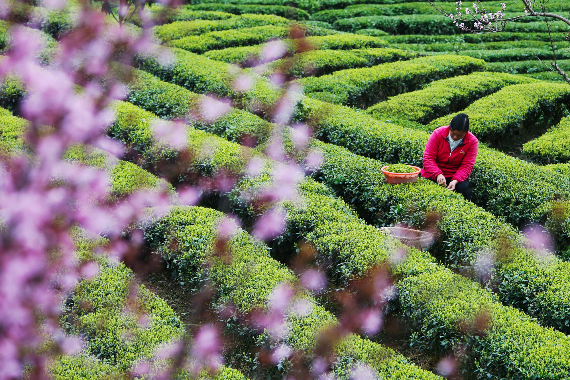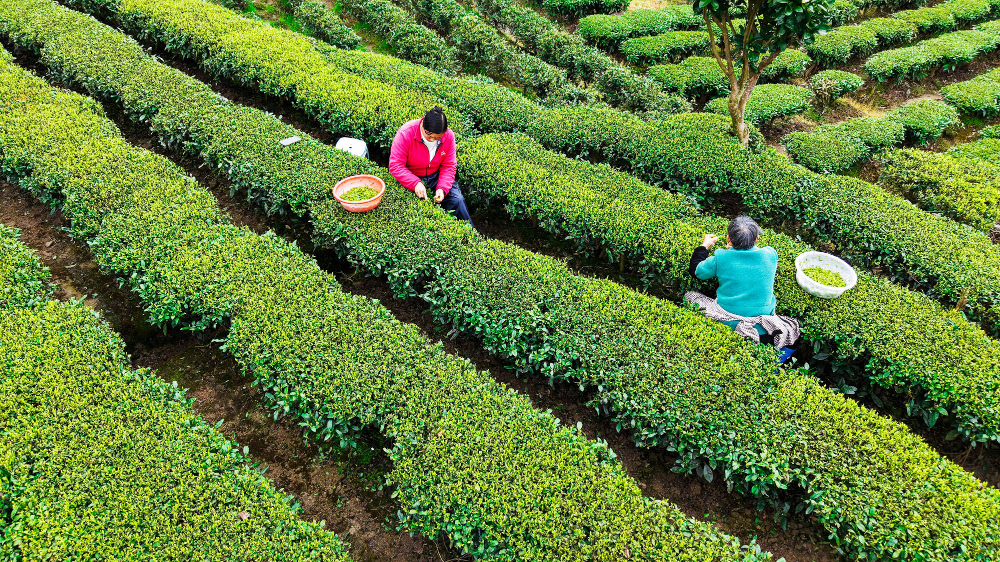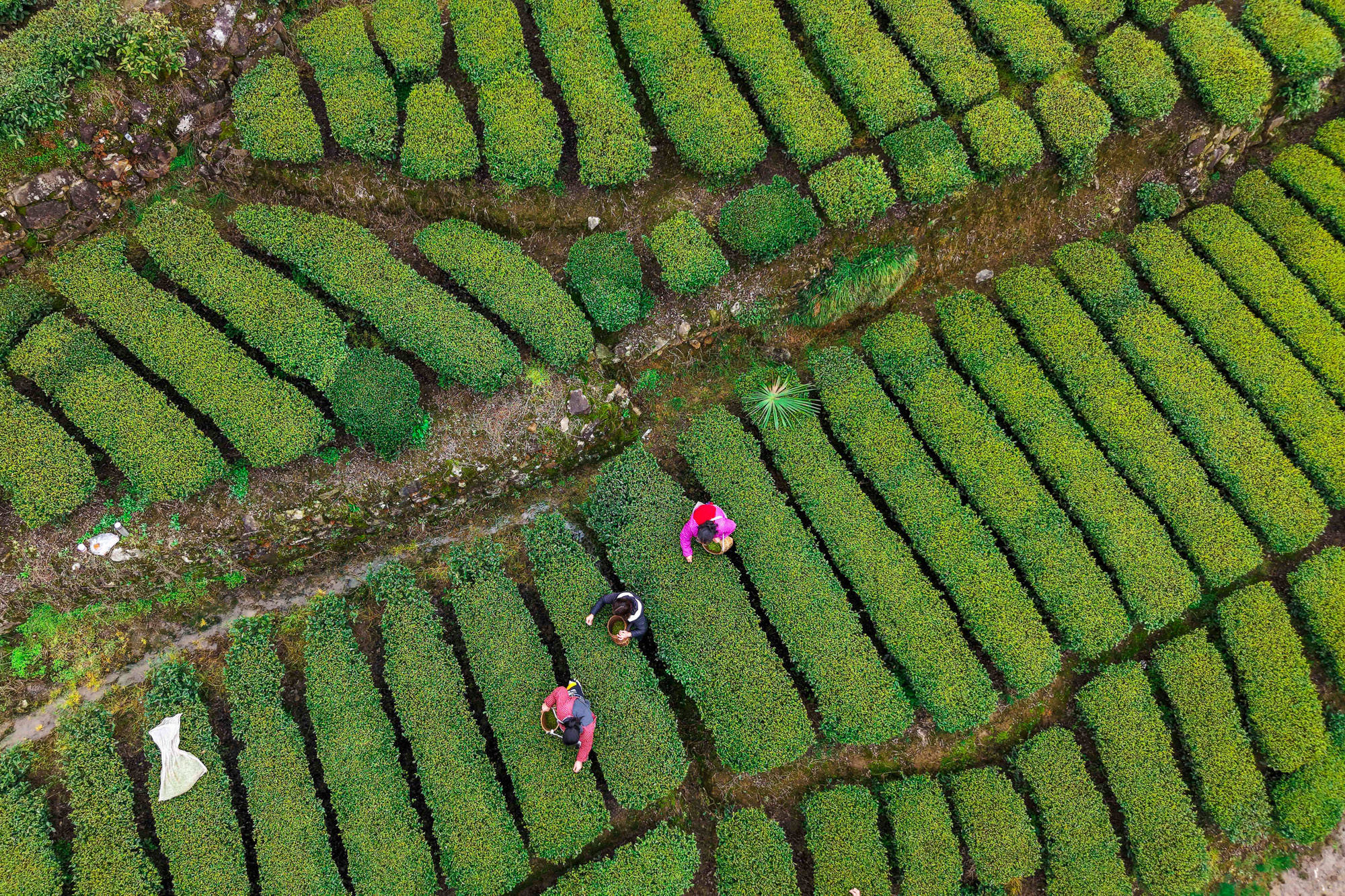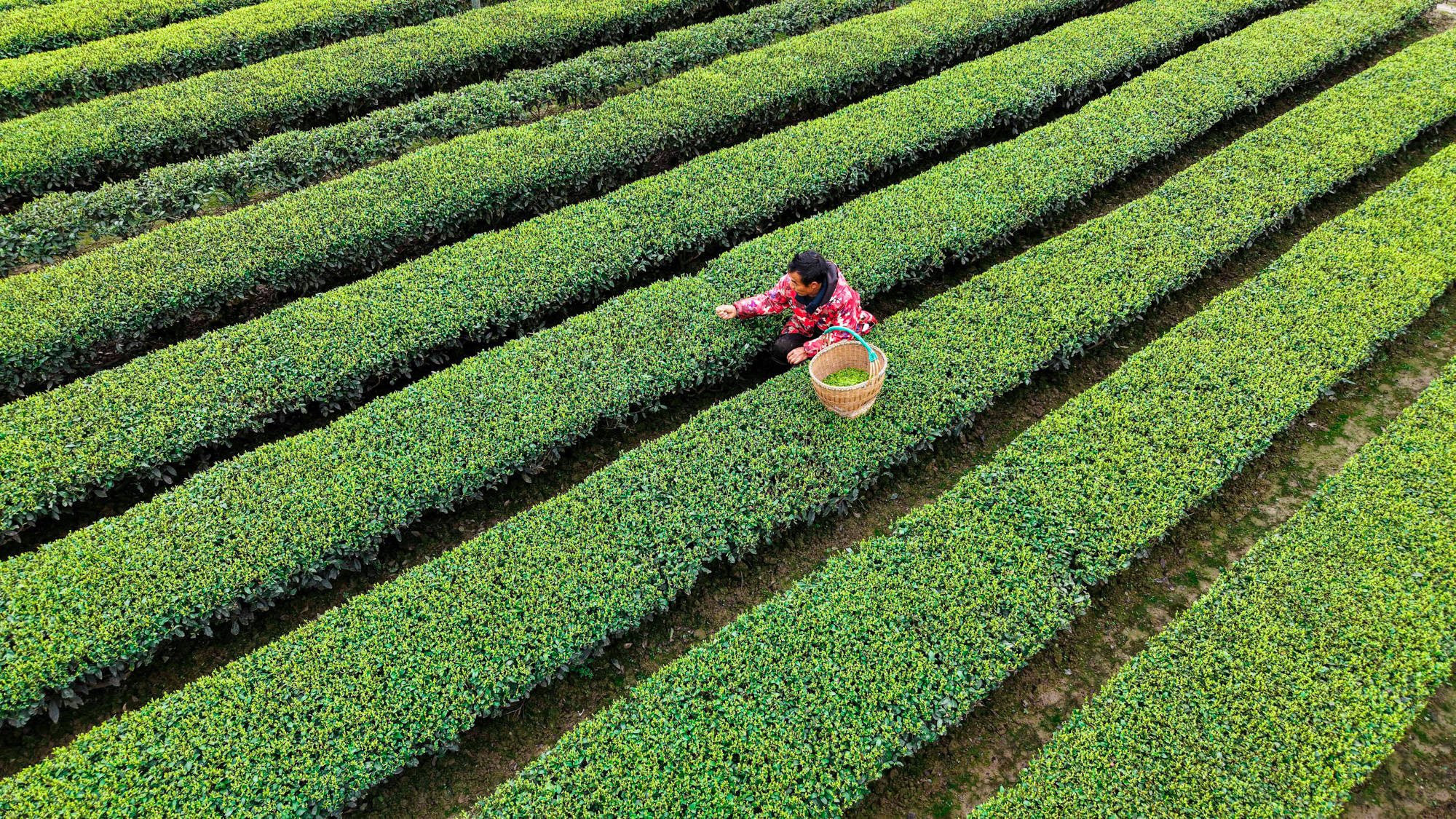 ↑2026年3月19日,湖北省恩施土家属(shu)苗族自治州咸丰县黄金洞乡尧坪村村民在采摘(zhai)明(ming)前茶。(无(wu)人(ren)机照片)CICPHOTO/李维君 摄(she)