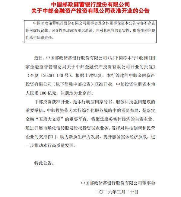中国网财经3月20日讯 今日,中国邮政储蓄(xu)银(yin)行发(fa)布公告称,收到《国家金融监督管理总局关于中邮金融资(zi)产投资(zi)无(wu)限(xian)公司开业的批复》(金复〔2026〕140号)。根据上述批复,该(gai)行筹建的中邮金融资(zi)产投资(zi)无(wu)限(xian)公司(以下简称中邮投资(zi))获准开业,中邮投资(zi)注册(ce)资(zi)源为人民币100亿(yi)元,注册(ce)地为北(bei)京市。