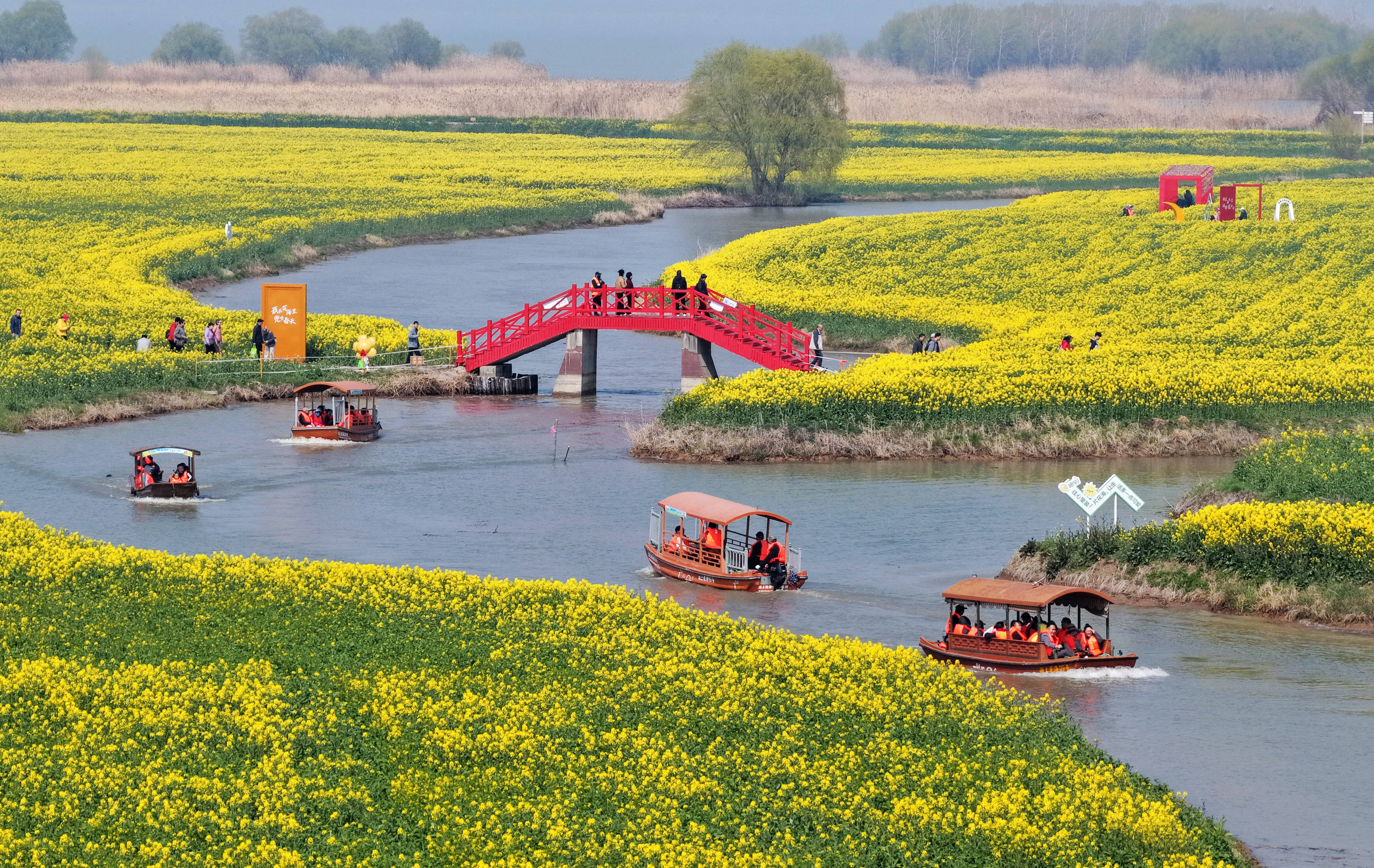 3月14日,游客在江苏省高邮市湖上花(hua)海景区乘(cheng)船赏花(hua)。新华社发(孟德龙摄)