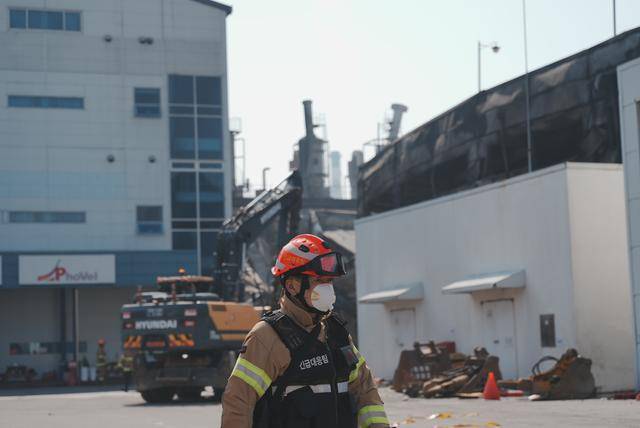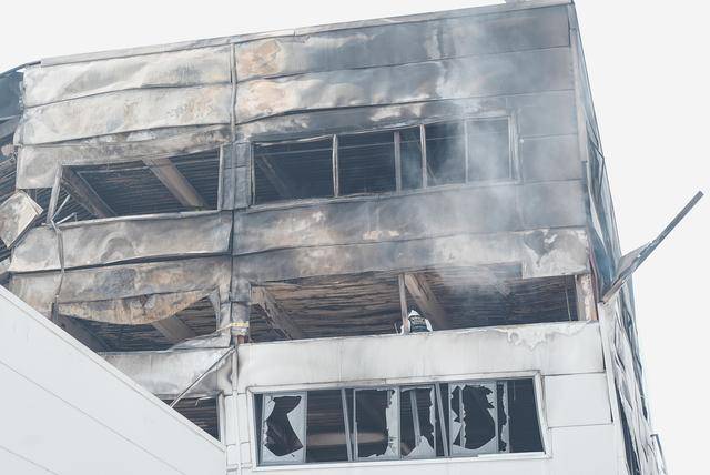 ↑3月(yue)21日(ri),救援人员在韩国大田工场火(huo)灾(zai)现场搜救。