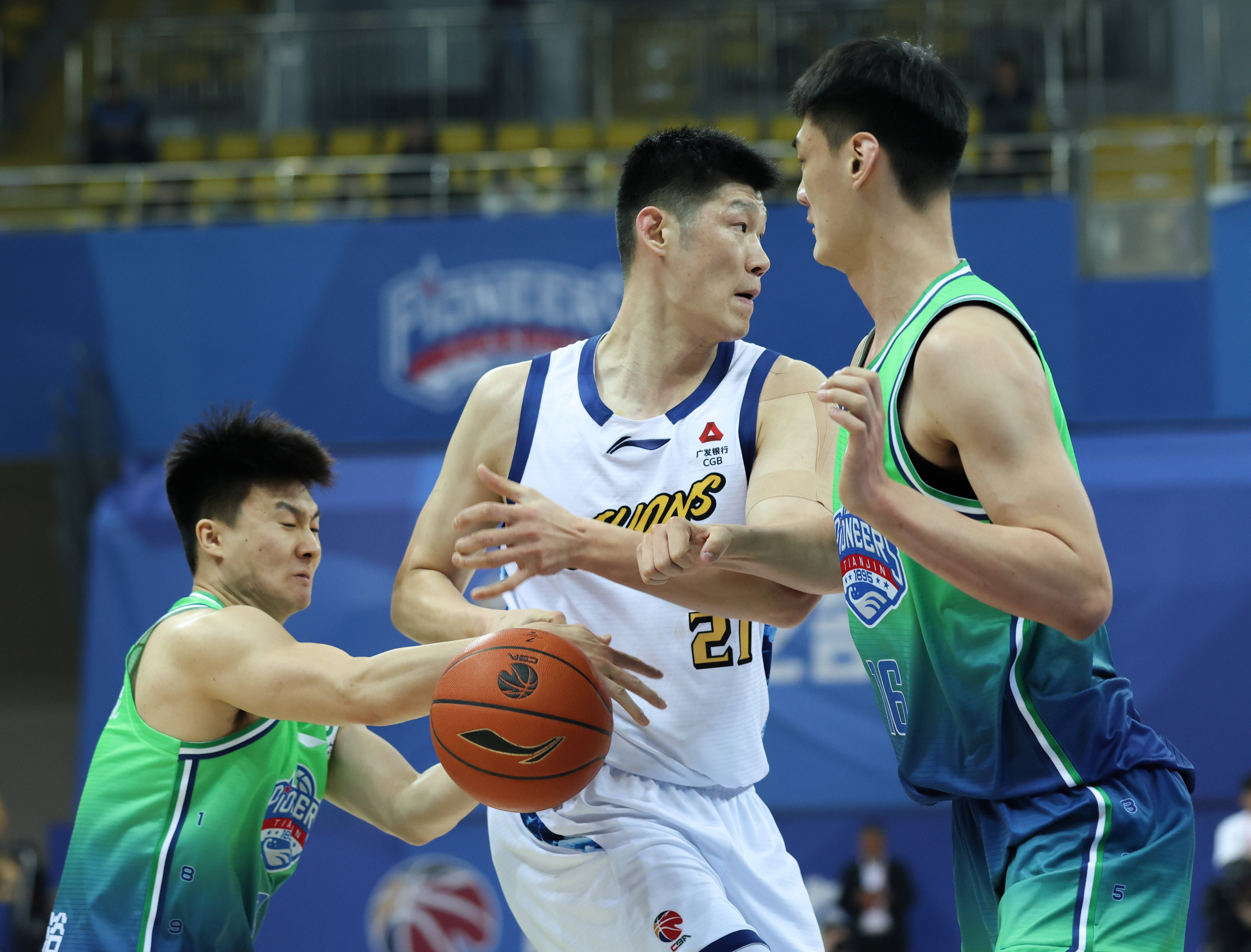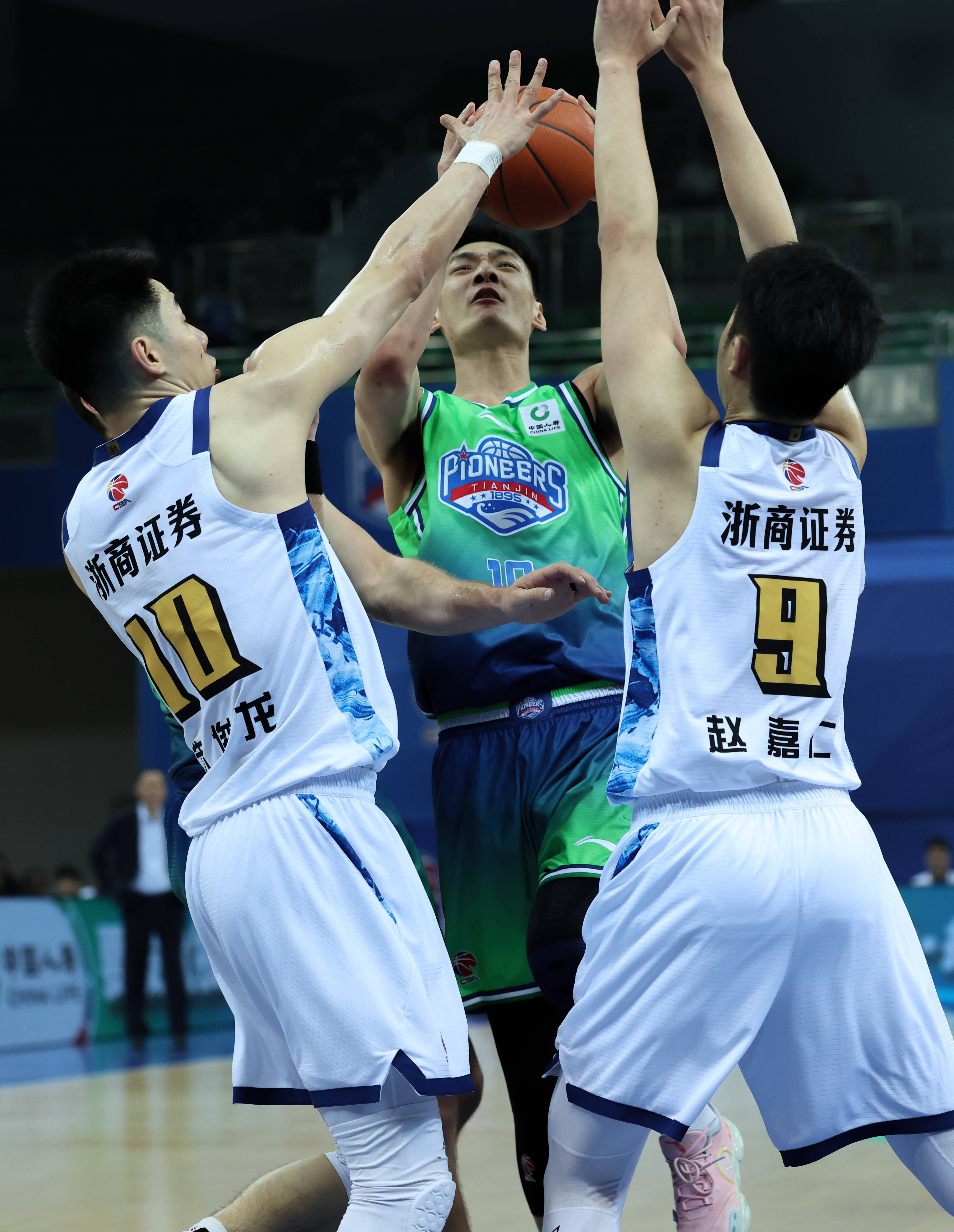 3月24日,浙江(jiang)浙商证券队球员(yuan)朱俊龙(左)与赵嘉仁(右)正在比赛中防守天津先行者队球员(yuan)田(tian)雨。 新华社记者 孙(sun)凡是越 摄