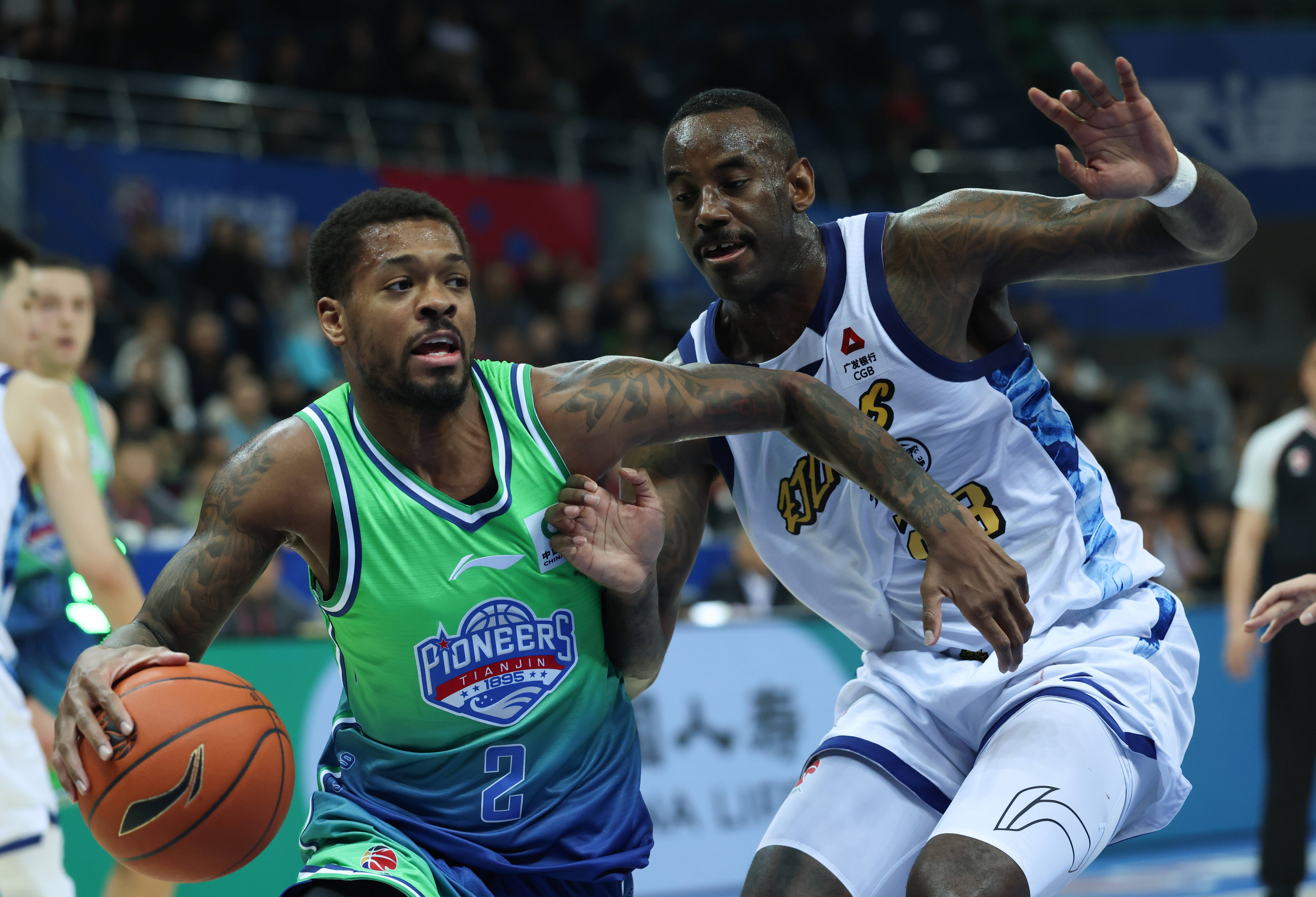 3月24日,天津先行者队球员(yuan)贾维(wei)恩·哈姆(mu)雷特(te)(左)与浙江(jiang)浙商证券队球员(yuan)吴骁正在比赛中拼抢。 新华社记者 孙(sun)凡是越 摄