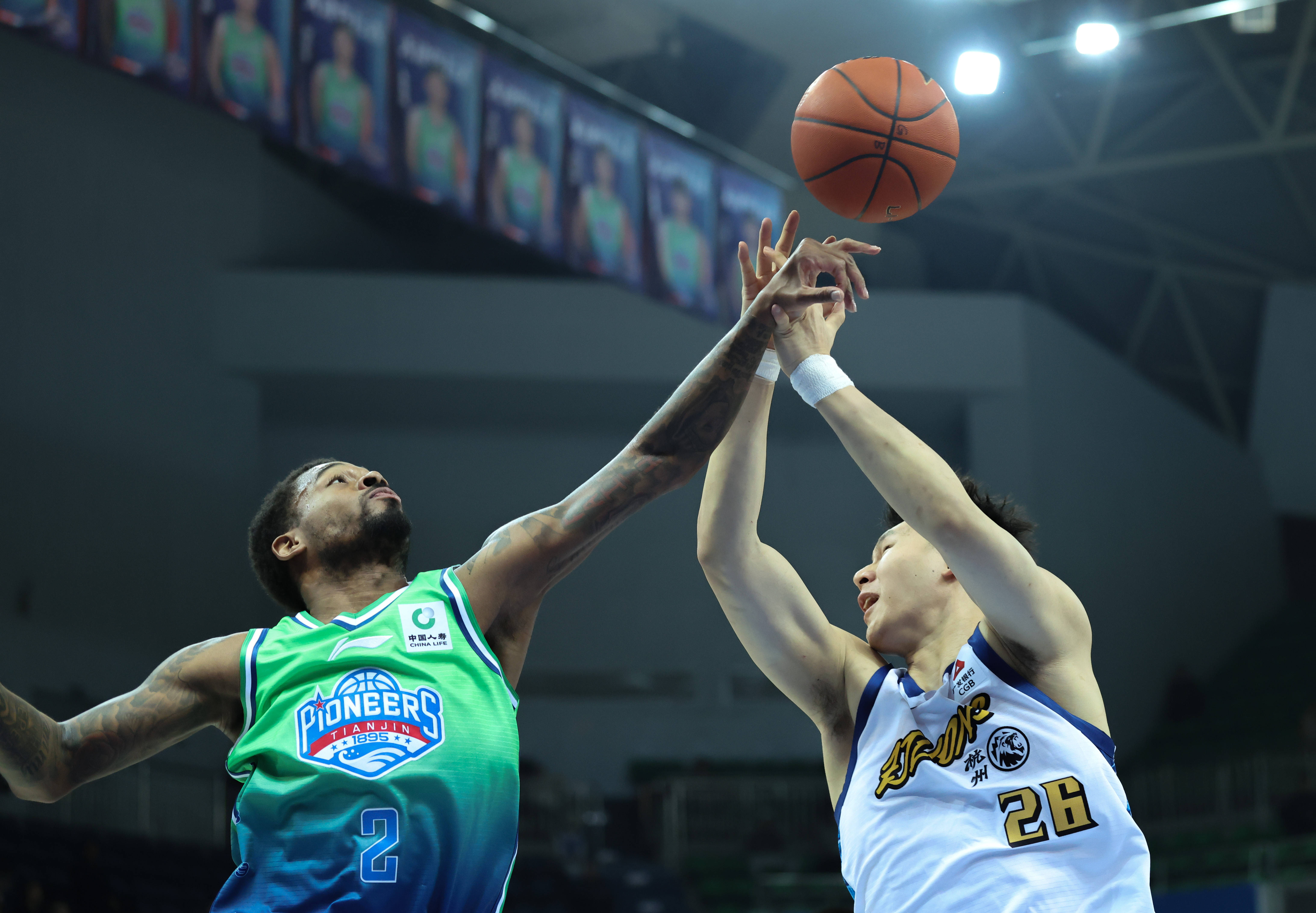 3月24日,浙江(jiang)浙商证券队球员(yuan)贾卡尔·桑普森(左)与天津先行者队球员(yuan)大卫·詹姆(mu)斯正在比赛中拼抢。 新华社记者 孙(sun)凡是越 摄