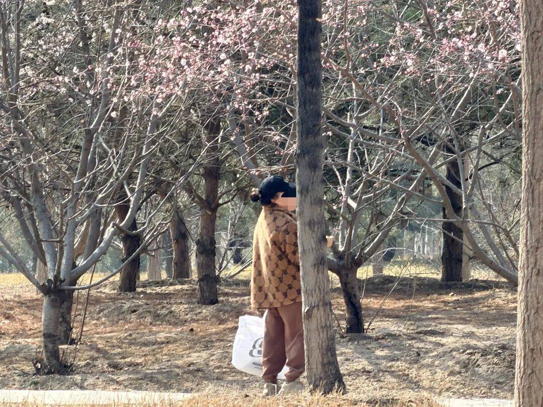 公园的(de)一处桃林里,粉白相间(jian)的(de)桃花开得正盛(sheng)。但就在这片美景中,一位大妈(ma)踮着脚尖(jian),伸手将缀满花朵的(de)枝条折断,放进随身携(xie)带(dai)的(de)塑料袋中。