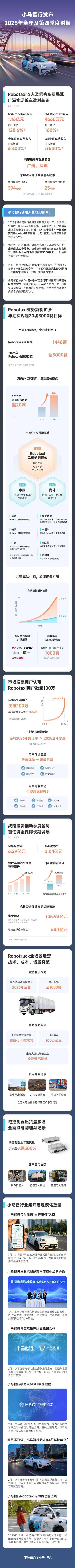小马智行首创人兼CEO彭军正(zheng)在财报中透露表现:“2025年是小马智行发展的关键(jian)一年。公司实现了营收规模、Robotaxi车队体量、运营网络覆盖及用户(hu)群体的全面扩大(da)。预测(ce)2026年,我们将加速推进营收增(zeng)进,将Robotaxi车队规模扩大(da)至3000辆以上,并正(zheng)在环球超20个城市部署Robotaxi。”