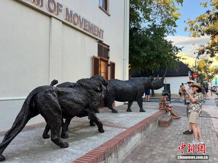 当地时间3月24日,游客持手机拍摄街边的动物金属雕塑。斯坦陵布什位于南非西开普省,建于1679年,是南非最古老的城镇之一。中新社(she)记者 孙翔 摄