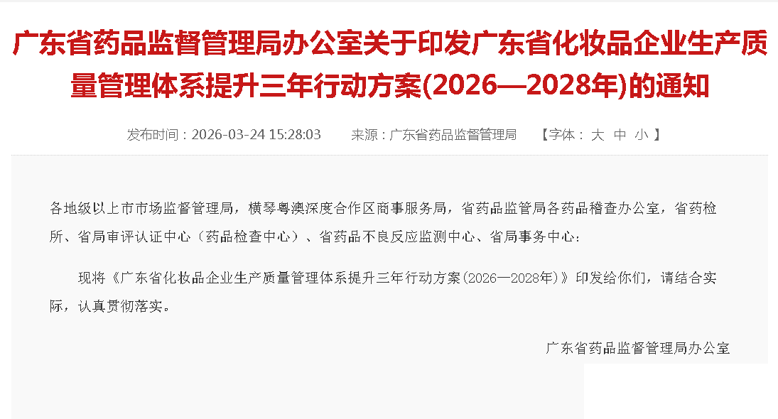 日前,广东省药品监督(du)管(guan)理局发布(bu)《广东省化(hua)妆品企业生产质量管(guan)理体(ti)系提(ti)升(sheng)三年(nian)行动计划(2026—2028年(nian))》,提(ti)出未来三年(nian)全省化(hua)妆品企业生产质量管(guan)理体(ti)系提(ti)升(sheng)的路线图,推动产业从“规模领先”向“质量引领”“创新驱(qu)动”跨越。