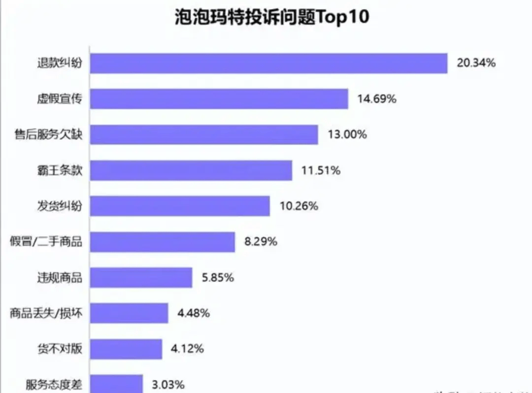 退款胶葛、售后服务短缺、发货胶葛及品控问(wen)题是(shi)泡泡玛特赞扬的“重灾区”。其中退款胶葛占比最高(gao)达20.34%;售后服务短缺紧随(sui)其后,占比13%;霸王条目和发货胶葛的占比也分别达到11.51%和10.26%。