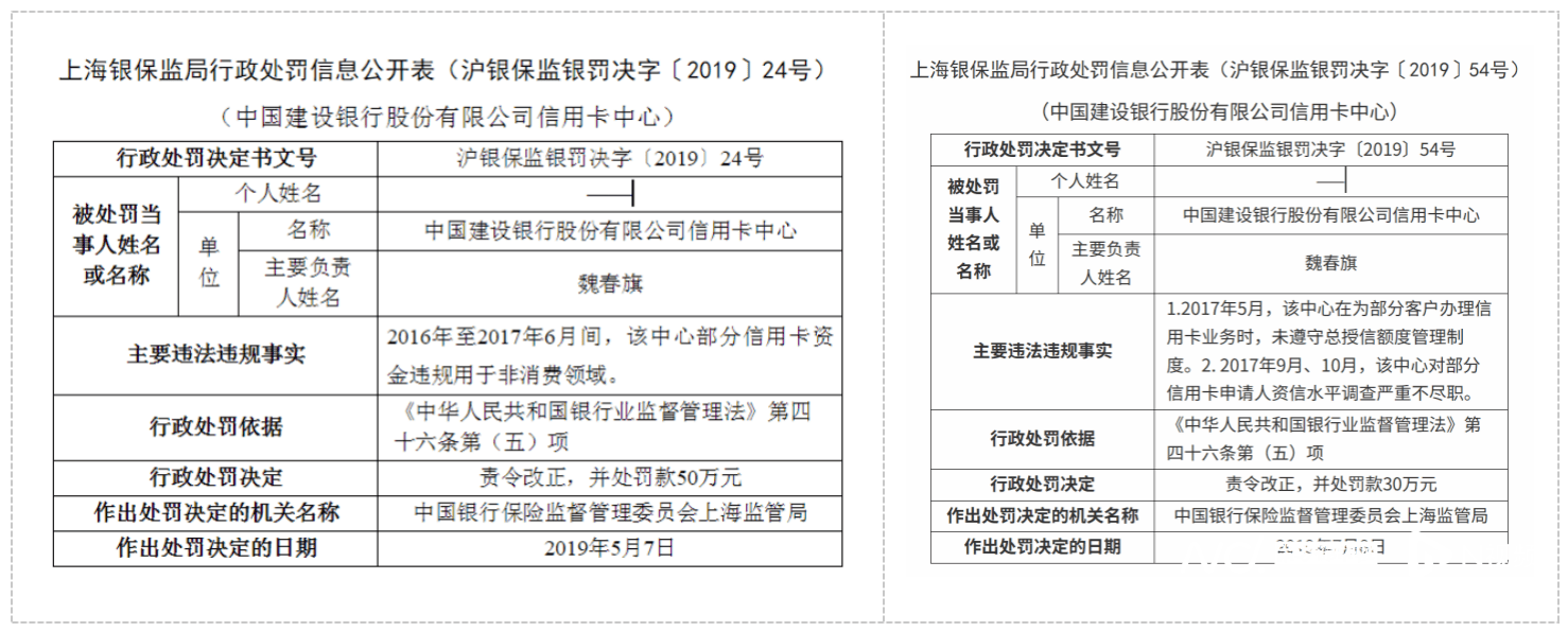 2019年5月7日,原上海银(yin)保监局公布(bu)行政惩罚(fa)决意书(沪银(yin)保监银(yin)罚(fa)决字〔2019〕24号),查明建行信用卡中心正在2016年至2017年6月间,存(cun)正在部份信用卡资金违(wei)规用于非消费领域的问题,责(ze)令其纠(jiu)正并惩罚(fa)款50万元(yuan)。同年7月8日,该中心再次收到罚(fa)单(dan)(沪银(yin)保监银(yin)罚(fa)决字〔2019〕54号),惩罚(fa)事由包含未恪(ke)守总授信额度经管轨制(zhi)、对部份信用卡请求人资信程(cheng)度调(diao)查严重(zhong)不失职(zhi),被(bei)责(ze)令纠(jiu)正并惩罚(fa)款30万元(yuan)。