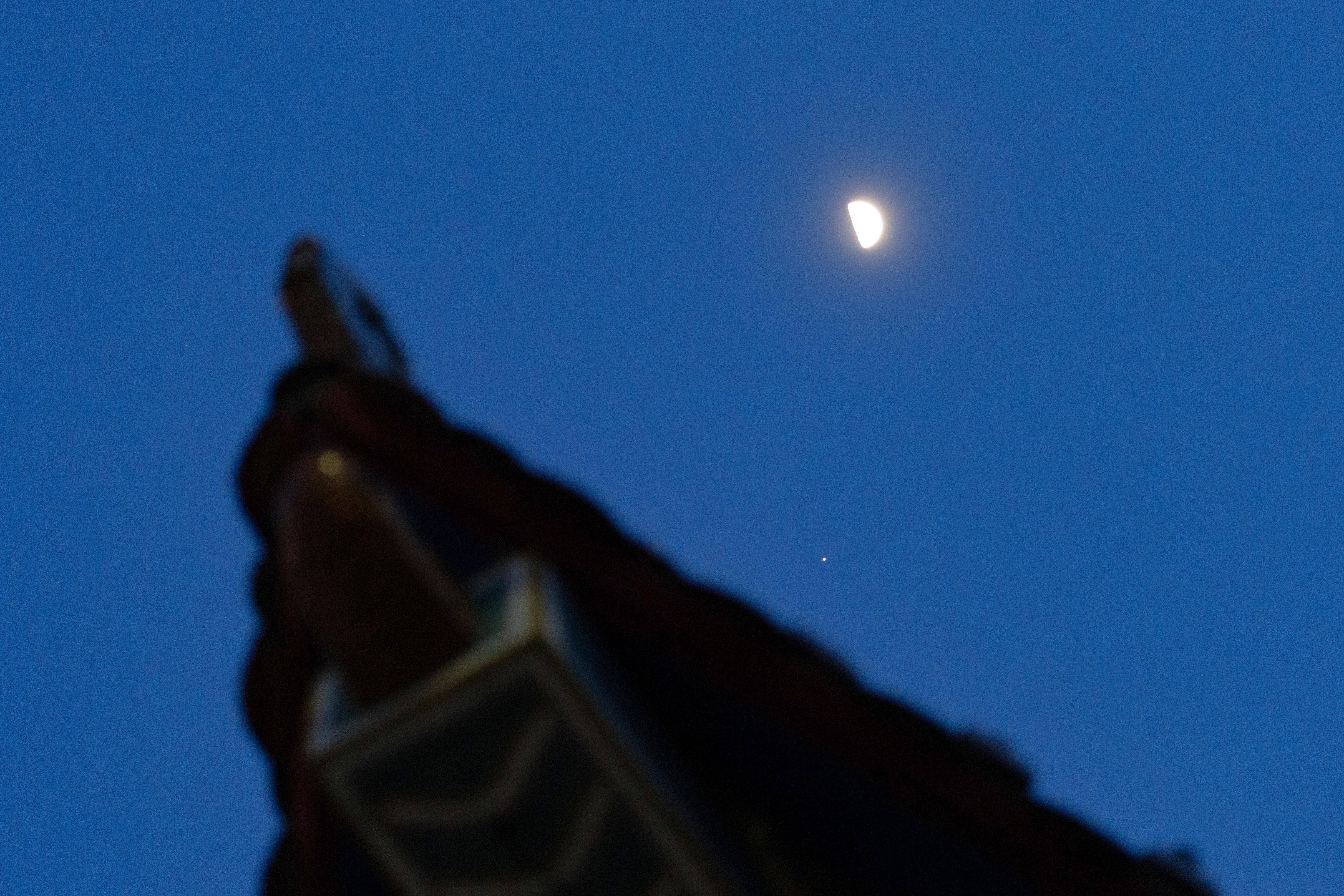 这(zhe)是3月26日在黑龙江(jiang)省哈尔滨市拍摄的木星合月。 新华社(she)发(原勇摄)