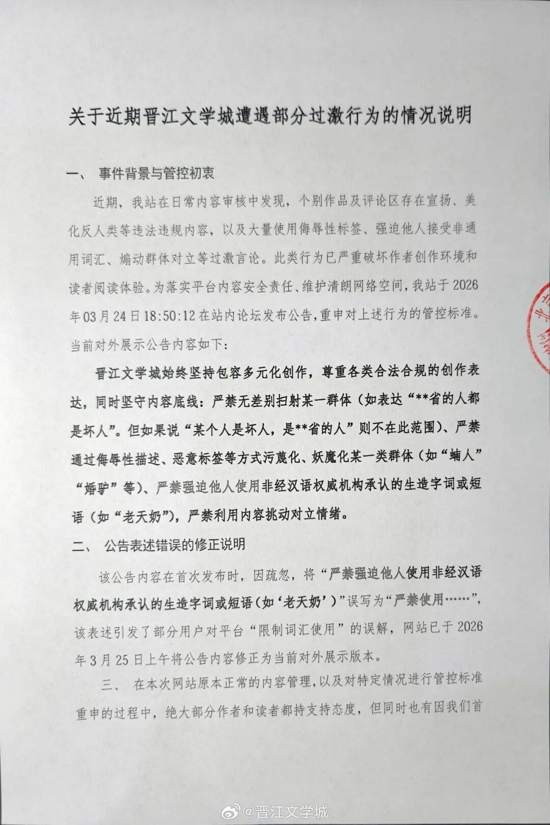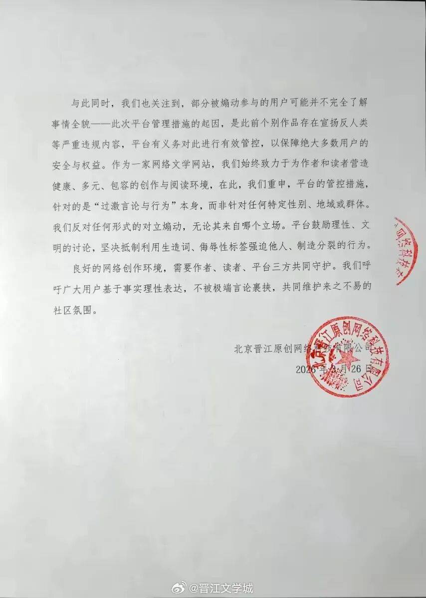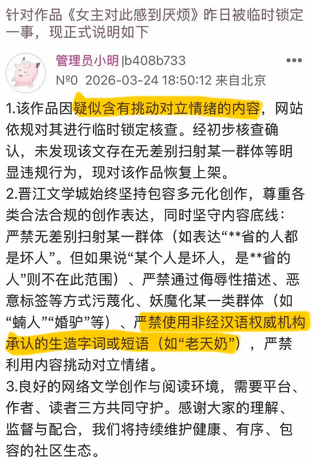 晋江文学城称,此前(qian)因疏忽(hu)将“严禁强迫他人使用(yong)非经汉语权威机构承认的生造字词或短语(如‘老天(tian)奶’)"误写为“严禁使用(yong)”,该表述引(yin)发了部分用(yong)户对(dui)平台“限定词汇(hui)使用(yong)”的误解,网站已于2026年3月(yue)25日(ri)上(shang)午将公告内容(rong)修(xiu)正为以后对(dui)外展示版本(ben)。