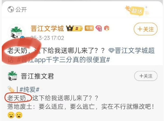 但有用(yong)户发现,晋江官方账号也曾使用(yong)过“老天(tian)奶”一词,这让用(yong)户对(dui)平台考核的公平性与“两重标(biao)准”发生了广泛质疑。遭用(yong)户质疑后,相关博文已被删除。