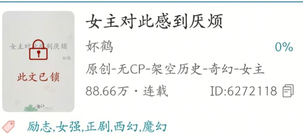 风波始于晋江文学城于克日(ri)突然锁定热门女(nu)性向小(xiao)说《女(nu)主对(dui)此感到讨厌(yan)》,相关提醒为“文章设定有问题,锁文要求清理”。这一操作迅(xun)速引(yin)发读者的不满与质疑。