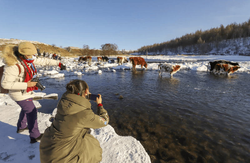 旅(lu)客在(zai)不冻河嬉戏(xi)(兴安盟(meng)融(rong)媒体中心(xin)供图)