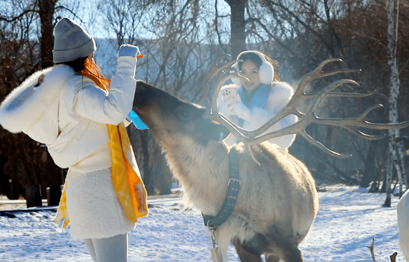 旅(lu)客与驯鹿互动(兴安盟(meng)融(rong)媒体中心(xin)供图)