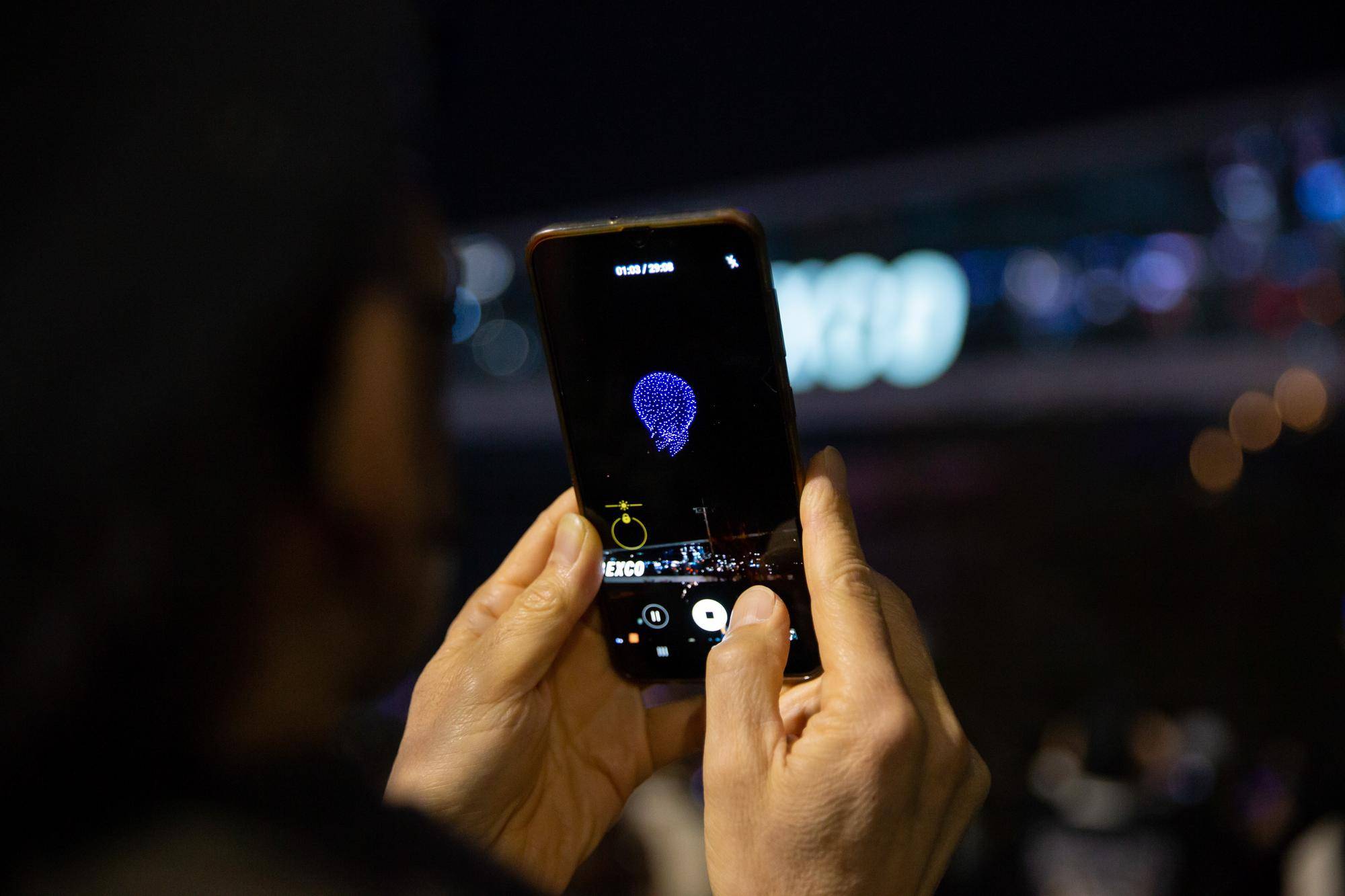 2023年2月23日,参观(guan)者在韩国釜山(shan)用手机拍摄(she)2023韩国无人机展上的无人机灯光表演。新华社记者王(wang)益亮摄(she)