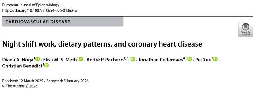 ①N^oga, D.A., Meth, E.M.S., Pacheco, A.P. et al. Night shift work, dietary patterns, and coronary heart disease. Eur J Epidemiol (2026).