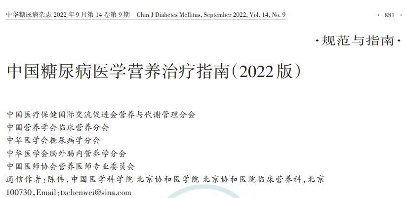 ④我国医疗保健国际(ji)交(jiao)流促进会养分与代(dai)谢(xie)管理分会,我国养分学会临床养分分会,中华医学会糖尿病学分会,等. 我国糖尿病医学养分治疗指南(2022版)[J]. 中华糖尿病杂志(zhi),2022,14(9):881-933. DOI:10.3760/cma.j.cn115791-20220704-00324.