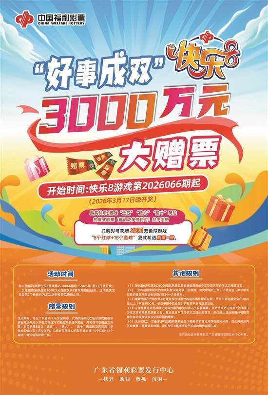 本次活(huo)动(dong)共安排3000万元赠(zeng)票资金,自(zi)中国福利彩票快乐8游戏第(di)2026066期(2026年3月17日晚开奖)起,至应赠(zeng)票金额达(da)到3000万元的当期快乐8游戏期后结束。活(huo)动(dong)结束之日起第(di)7个自(zi)然日为本次活(huo)动(dong)赠(zeng)票兑领截止日。