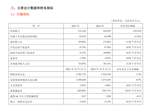 报告显示,2025年该行实现营业收(shou)入1314.42亿(yi)元(yuan),同比下降10.4%;实现归属于母公司股东的净利润为426.33亿(yi)元(yuan),同比下降4.2%。对此,平(ping)安银行表(biao)示,一(yi)方面受贷款利率(lu)下行和业务结构调整(zheng)等因素影响,净息差1.78%,同比下降9个基(ji)点;另(ling)一(yi)方面主要受市场波动影响,债券投资等业务非利息净收(shou)入下降。