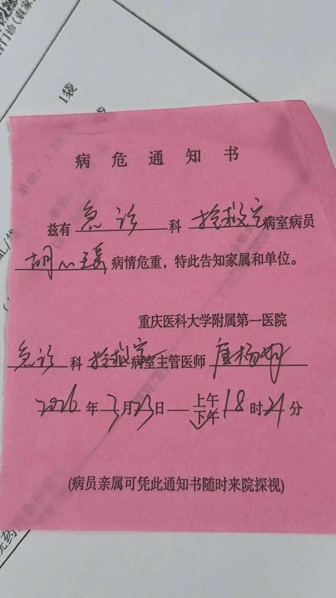 23日下(xia)昼,她在重庆医科大学附属第一(yi)病院,又收到了一(yi)张病危通知单,“本年已经收了十几张了”。
