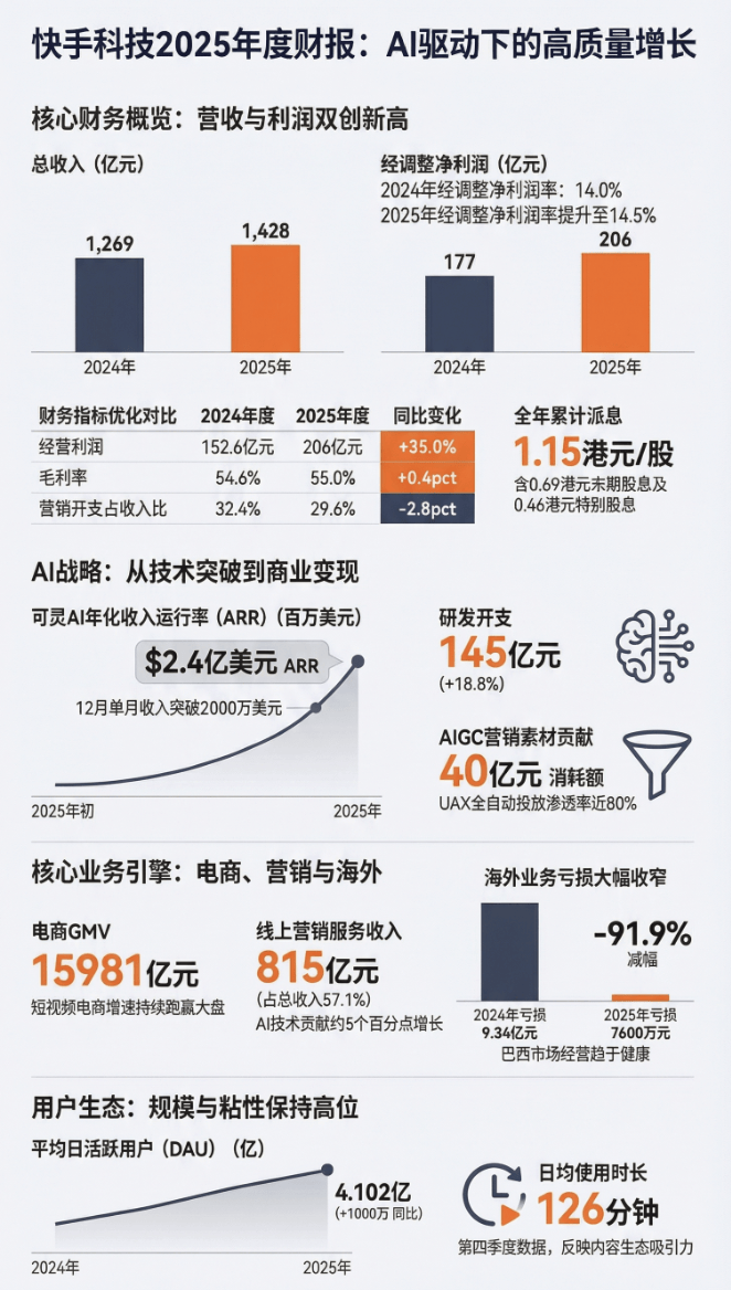 快手科技2025年(nian)全年(nian)功绩实现全面(mian)增长(chang),正在加大AI投(tou)入的同(tong)时(shi),盈利能力持续提升,营(ying)收、利润均创历史新高,并宣告年(nian)度末期(qi)股息。