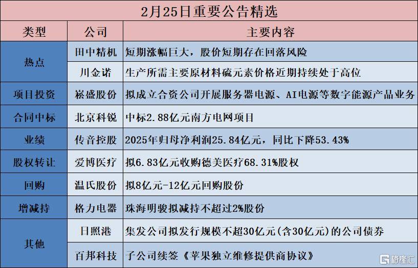 田中精(jing)机(300461.SZ):短期涨(zhang)幅巨大,股价短期存正在回落风险 川金诺(300505.SZ):生产所需首要原材料硫元素代价近期持续处于(yu)高位(wei),可能导致生产本钱上升 【 项 目 投资(zi)】 崧(song)盛股份(301002.SZ):拟成(cheng)立合(he)资(zi)公司开(kai)展服务器电源、AI电源等数(shu)字能源产物业务 【中标 合(he) 同 】 *ST松发(603268.SH):恒力造船(chuan)签(qian)约3艘超大型原油运输船(chuan)建造合(he)同 北(bei)京科(ke)锐(002350.SZ):中标2.88亿元南方电网(wang)项目 北(bei)新路桥(002307.SZ):联合(he)体(ti)中标G60沪昆高速公路桐乡高桥段改建工程第TJ02标段 华电科(ke)工(601226.SH):收(shou)到8.27亿元中标通知书 【业绩 】