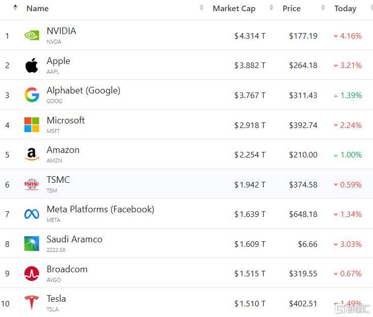 仅次于英伟达、苹果、谷歌、微(wei)软、亚马(ma)逊和台积电(dian)6家巨头,在(zai)全球市(shi)值排行榜中位列第7。