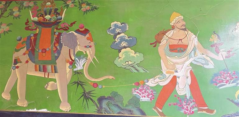 西藏民居的大(da)门壁(bi)画“财神牵(qian)象图” 。
