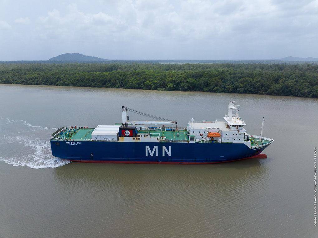 “微笑卫星”任务自2025年10月28日通过中欧(ou)联合出厂(chang)评审后(hou),全面进入发射实施阶段。2025年11月底,卫星所需推进剂从上海启运,2026年2月初(chu)运抵库鲁码头并(bing)转运至发射场。2026年2月11日,正样星及(ji)地检设备从位(wei)于荷兰的欧(ou)洲航天技术中心出发,从阿姆斯特丹码头搭乘“蜂(feng)鸟号”货轮横穿大西洋,于2026年2月26日抵达库鲁码头并(bing)顺利转运至发射场。