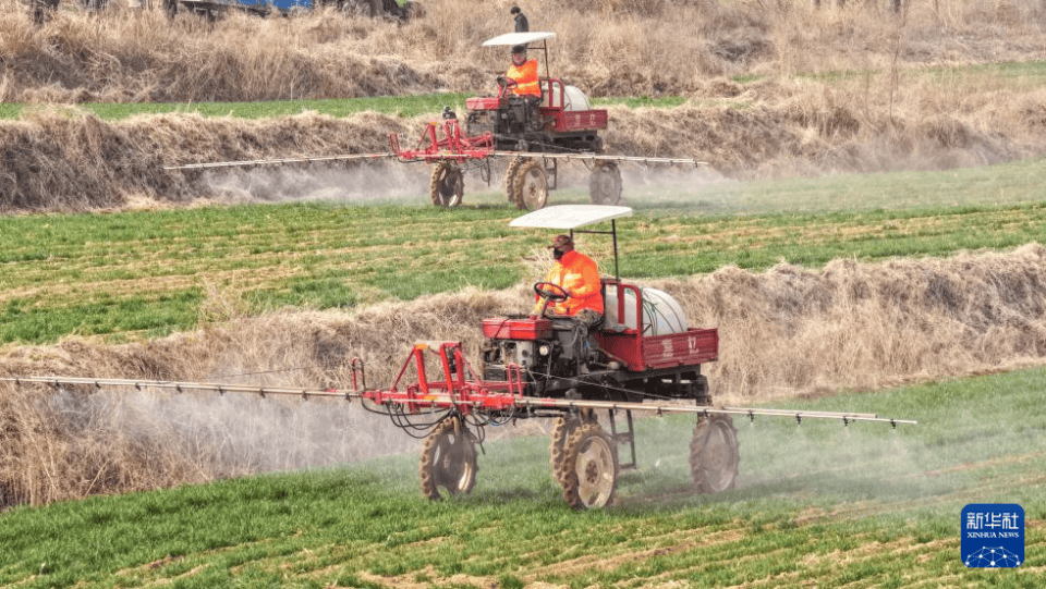 3月23日,在(zai)山东省(sheng)荣成市(shi)虎山镇,农机手对小麦举行施肥(fei)和(he)病虫害防控功课。新华社发(李信君(jun)摄)