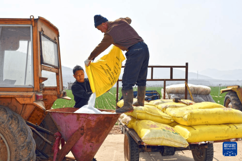 3月23日,在(zai)山东省(sheng)烟台(tai)市(shi)福山区高疃镇,农民(min)准备为小麦施肥(fei)。新华社发(孙文潭摄)