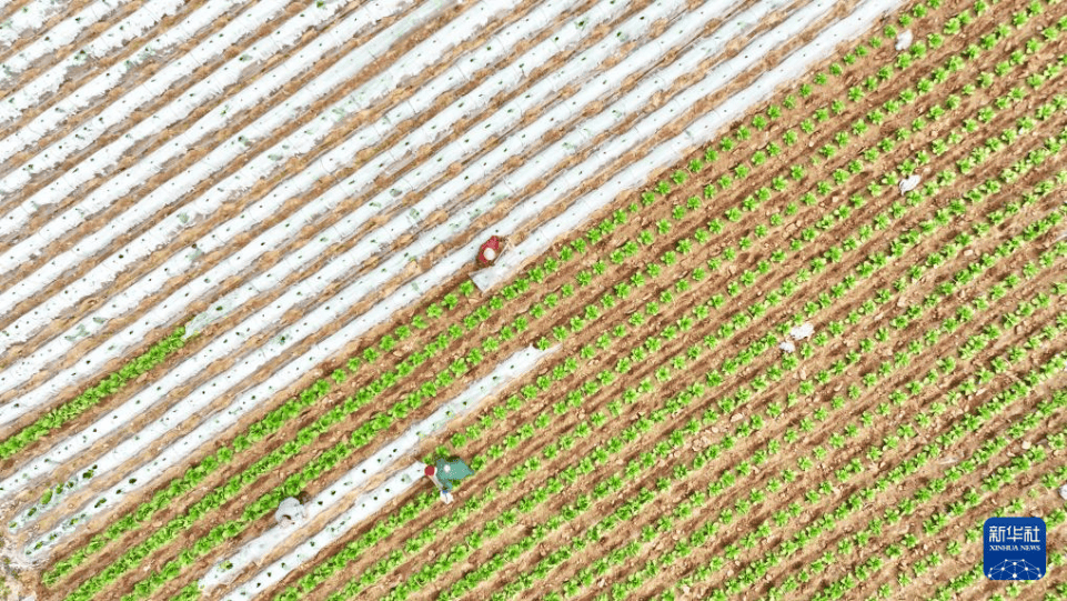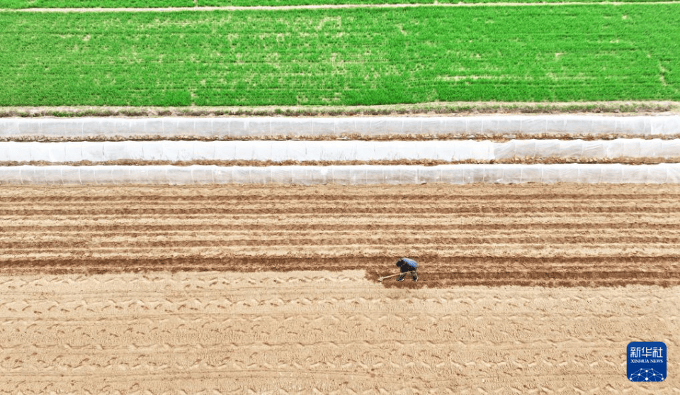 3月23日,在(zai)山东省(sheng)临沂市(shi)郯城(cheng)县郯城(cheng)街道,农民(min)在(zai)蔬菜种植基地(di)劳作(无人(ren)机照片(pian))。新华社发(张春雷摄)