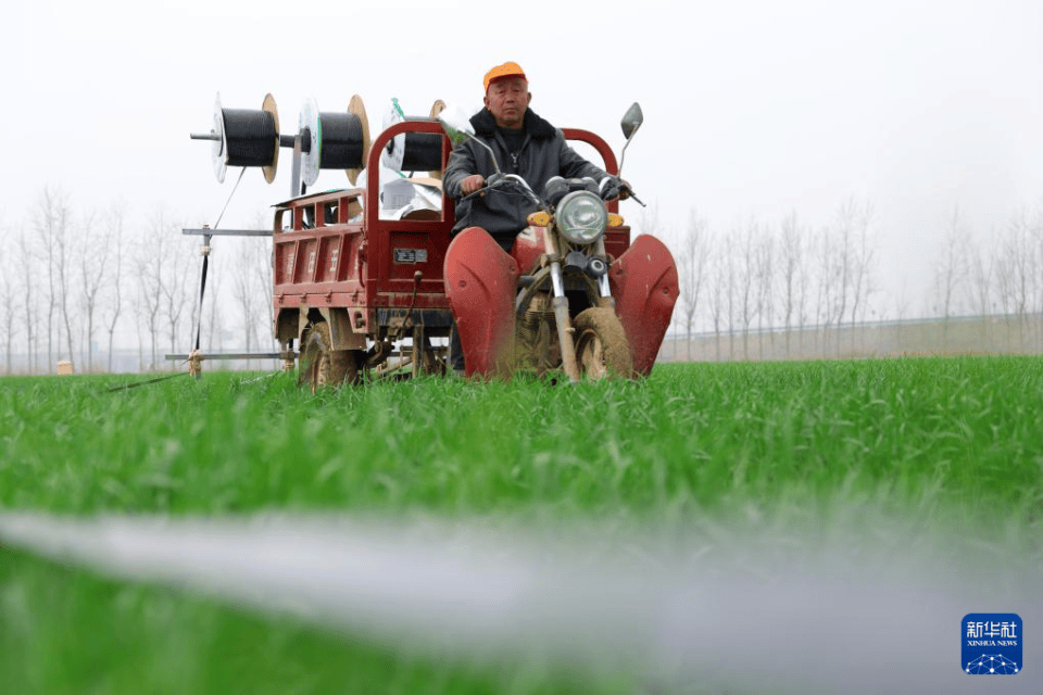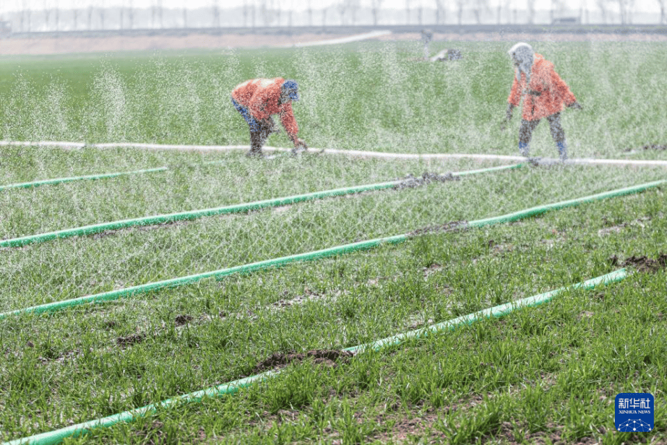 3月23日,在(zai)山东省(sheng)聊城(cheng)市(shi)茌平区冯官(guan)屯镇,农民(min)给小麦铺设滴灌带(dai)。新华社发(马红坤摄)