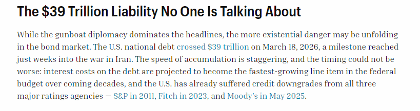 2026年3月18日,美国的国债规模首次突破39万亿美元大关,而这恰恰出现在对伊朗发(fa)动(dong)军事行动(dong)的几周之后。债务积累(lei)的速度令人震(zhen)惊,而且时机也极(ji)为(wei)不利:预(yu)计未来几十年,债务利息(xi)成本(ben)将成为(wei)美国联邦预(yu)算中增(zeng)长最快的项目,三大评级机构,标准普尔于 2011 年、惠誉于 2023 年、穆迪于 2025 年 5 月分别下调了美国的信用评级。